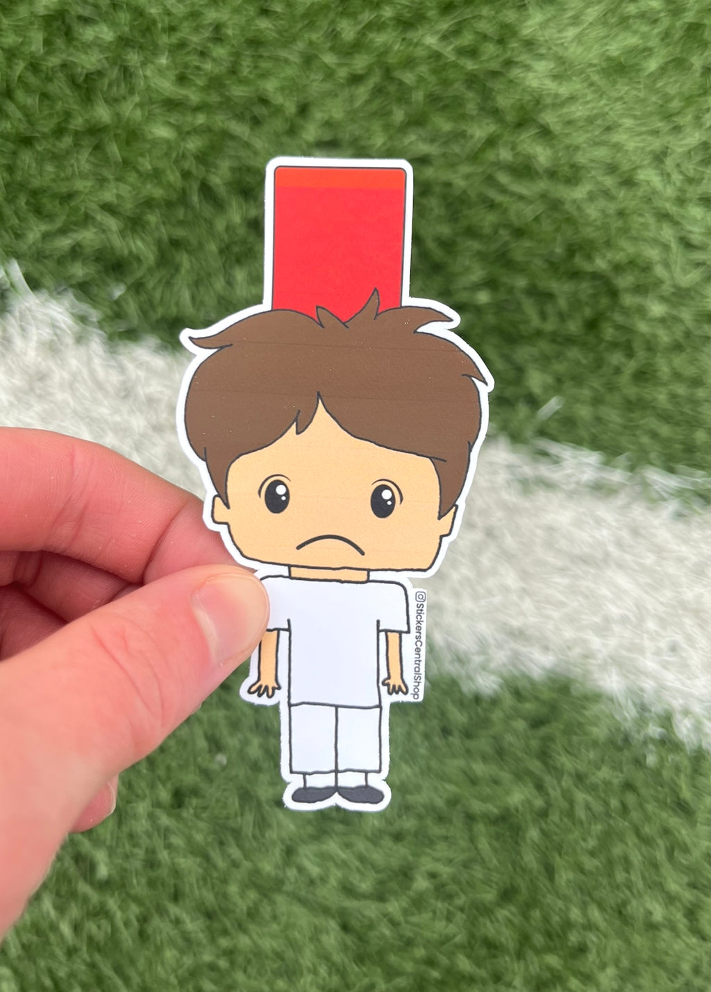 Our England Red Card Soccer Player Sticker captures the dramatic moment of a soccer player receiving the infamous red card! Illustrated on the sticker is a dejected soccer player in the process of being ejected from the soccer match! Let our soccer player receiving the red card become a statement piece in your collection, where every decision sparks conversation and fuels the love for the beautiful game! Immerse yourself in the intensity and emotion of the game with this striking sticker, depicting the pivotal moment of player discipline on the field. It serves as a powerful reminder of the passion, highs and lows and consequences woven into the fabric of soccer.